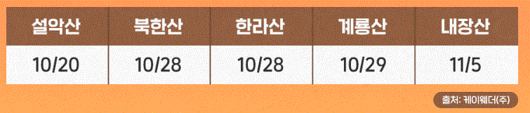 케이웨더는 2024년 주요 산 단풍 절정 예측시기는 설악산 : 10/20 , 북한산 : 10/28, 한라산: 10/28, 계룡산: 10/29, 내장산: 11/9 일이라고 발표했습니다. 위쪽 지역부터 단풍이 들기 시작하니 가고 싶은 산별로 확인하시면 쉽게 단풍절정을 확인하실 수 있습니다.