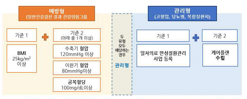 20~64세 일반건강검진 받은 분 중 체질량지수(BMI) 25kg/m2 이상이면서 수축기 혈압 120mmHg 이상(또는 이완기 혈압 80mmHg 이상) 또는 공복혈당 100mg/dL 이상에 포함되는 사람입니다. 아래표에서 주의범위, 위험범위에 속합니다.