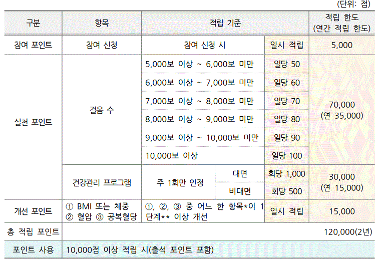 예방형 : 걷기, 건강관리 프로그램 참여, 건강개선에 참여하면 포인트가 적립이 가능하며, 2년 동안 최대 12000포인트 적립이 가능합니다.