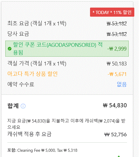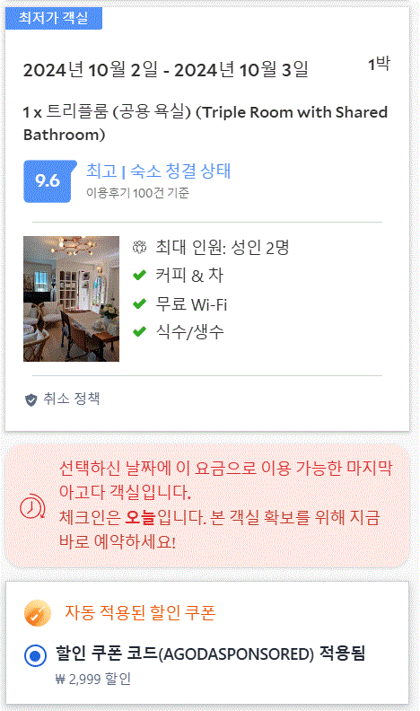 아고다로 예약시 쿠폰 적용하면 3일후 만료되는 할인쿠폰과 일정기간 15% 까지 추가 요금할인 받을수 있는 쿠폰이 있습니다.