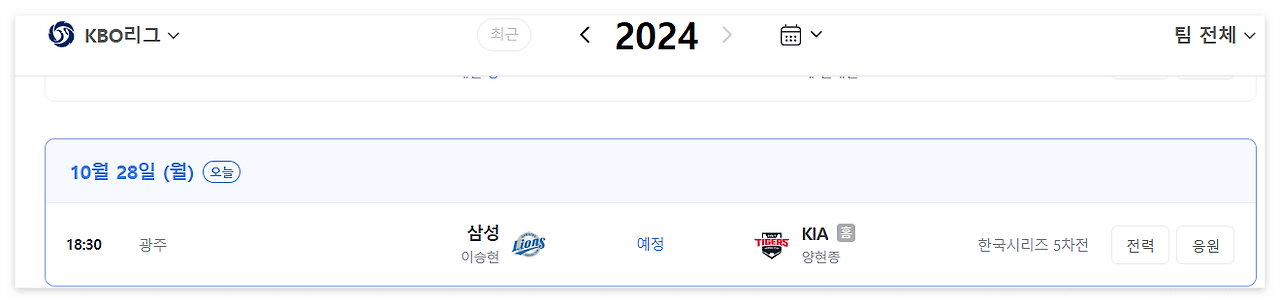 기아 타이거즈, 삼성 라이온즈의 한국시리즈 5차전 경기가 2024년 10월 28일 6시 30분 광주에서 진행됩니다. KIA타이거즈가 2024 한국시리즈 우승까지 단 1승만 남겨두고 있기 때문에 이번 경기 승패에 따라 6차전까지 진행될지 결정됩니다.