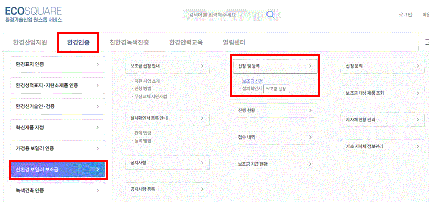 온라인 신청 시 '에코스케어' 홈페이지에서 환경인증 -> 친환경 보일러 보조금 -> 신청 및 등록에 보조금 신청에 들어가서 신청하셔야 합니다.