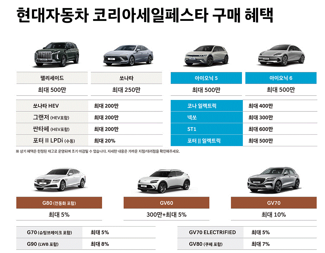 2024 코리아세일패스타에서 현대차는 할인차종을 24종으로 확대하고 국민차종, 친환경차 등을 중심으로 높은 할인 행사를 합니다.