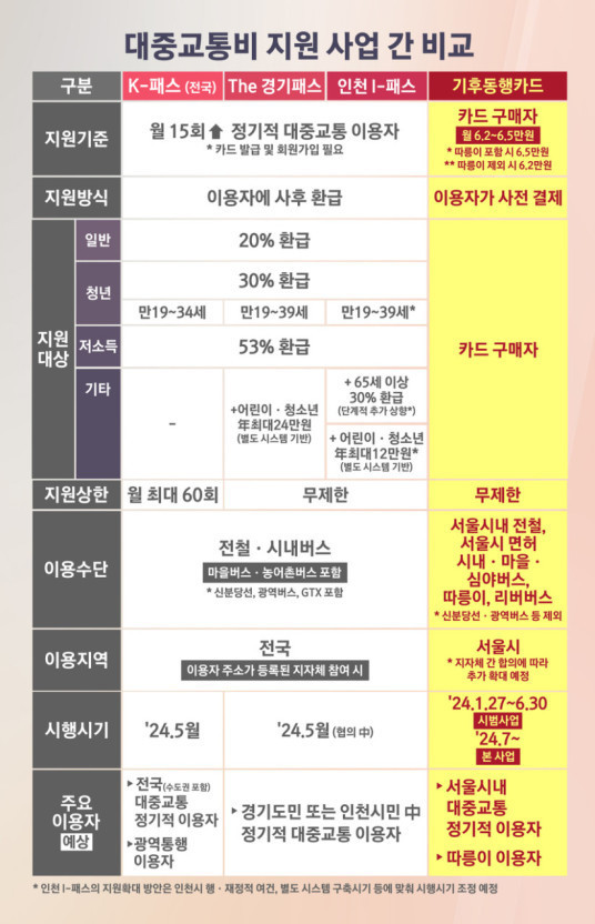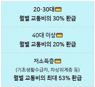 - 저소득층 : 기초생활 수급자, 차상위계층 등은 교통비의 최대 53% 환급